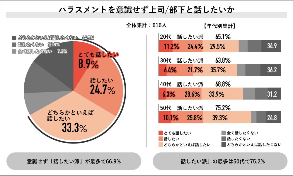 回答者全体の616人にハラスメントを意識せず上司/部下と話したいかを聞くと、「話したい派」が66.9%で過半数を占め、内訳は「とても話したい」8.9%、「話したい」24.7%、「どちらかといえば話したい」33.3%でした。「話したい派」の年代別割合では50代が75.2%で最多となり、次いで40代が68.8%、20代が65.1%、30代が63.8%という結果になりました。