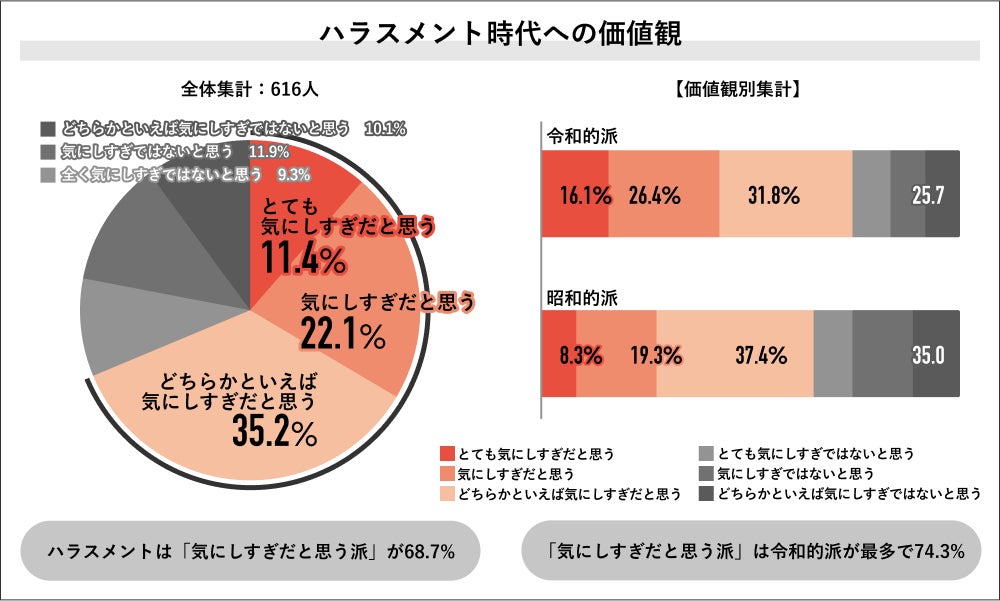 回答者全体の616人にハラスメント時代への価値観を聞くと「気にしすぎだと思う派」が68.7%で過半数を占め、内訳は「とても気にしすぎだと思う」11.4%、「気にしすぎだと思う」22.1%、「どちらかといえば気にしすぎだと思う」35.2%でした。「気にしすぎだと思う派」の価値観別割合では、令和的派が74.3%、昭和的派が65.0%の結果になりました。