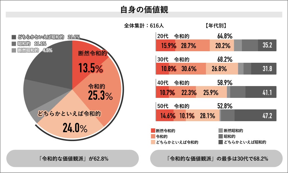 回答者全体の616人に自身の価値観を聞くと、「令和的な価値観派」が62.8%で過半数を占め、内訳は「とても令和的」13.5%、「令和的」25.3%、「どちらかといえば令和的」24.0%でした。「令和的な価値観派」の年代別割合では30代が68.2%で最多となり、次いで20代が64.8%、40代が58.9%、50代が52.8%の結果になりました。
