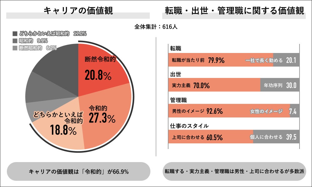 回答者全体の616人にキャリアの価値観を聞くと、「令和的な価値観派」が66.9%で過半数を占め、内訳は「とても令和的」20.8%、「令和的」27.3%、「どちらかといえば令和的」18.8%でした。また、転職やキャリアに関する項目ごとに聞くと、それぞれ「転職が当たり前派」が79.9%、「出世は実力主義派」が70.0%、「管理職は男性のイメージ派」が92.6%、「仕事のスタイルは上司に合わせる派」が60.5%となりました。