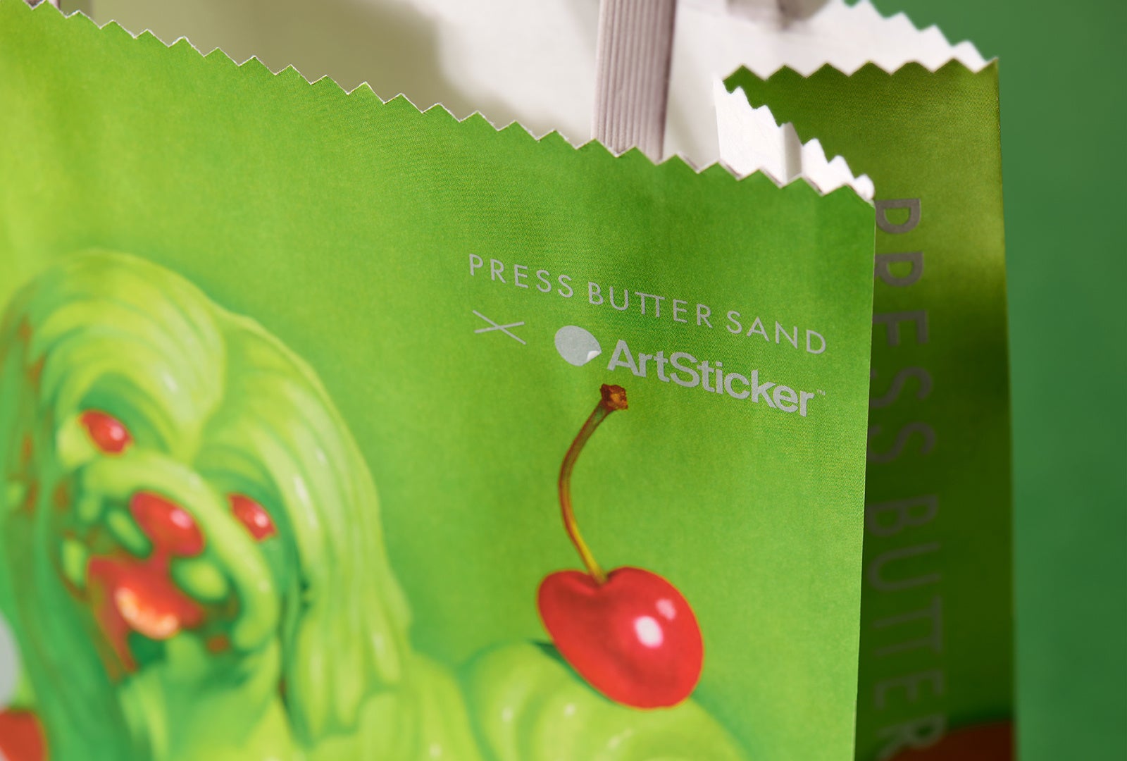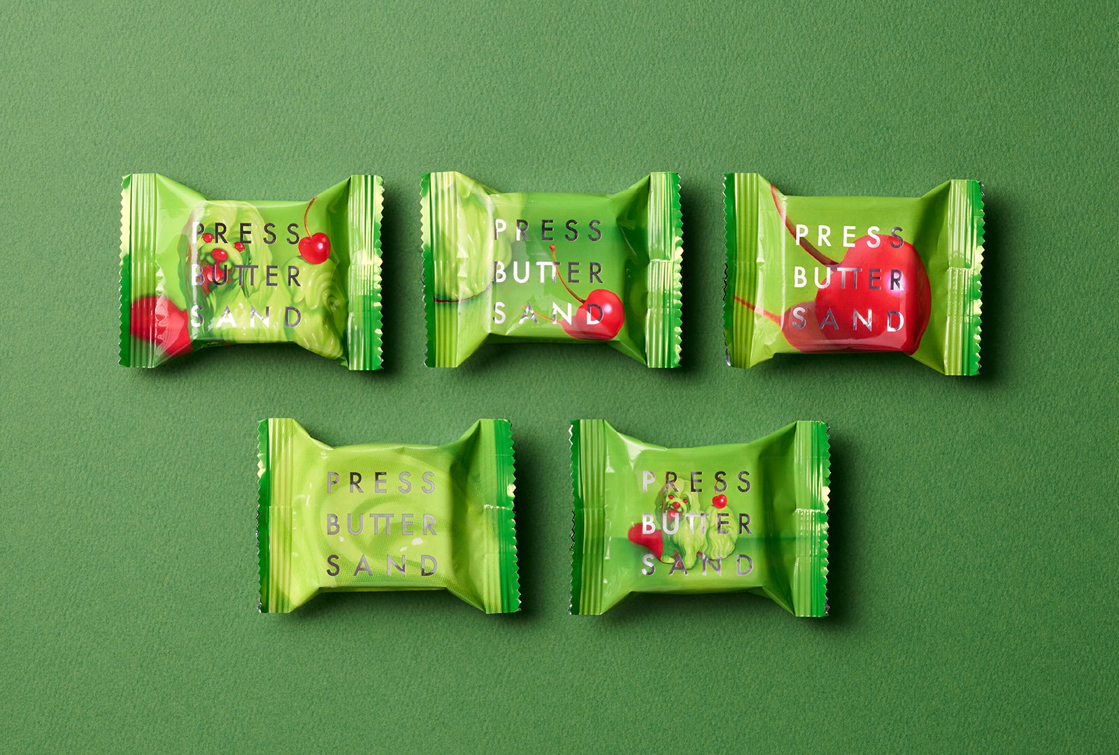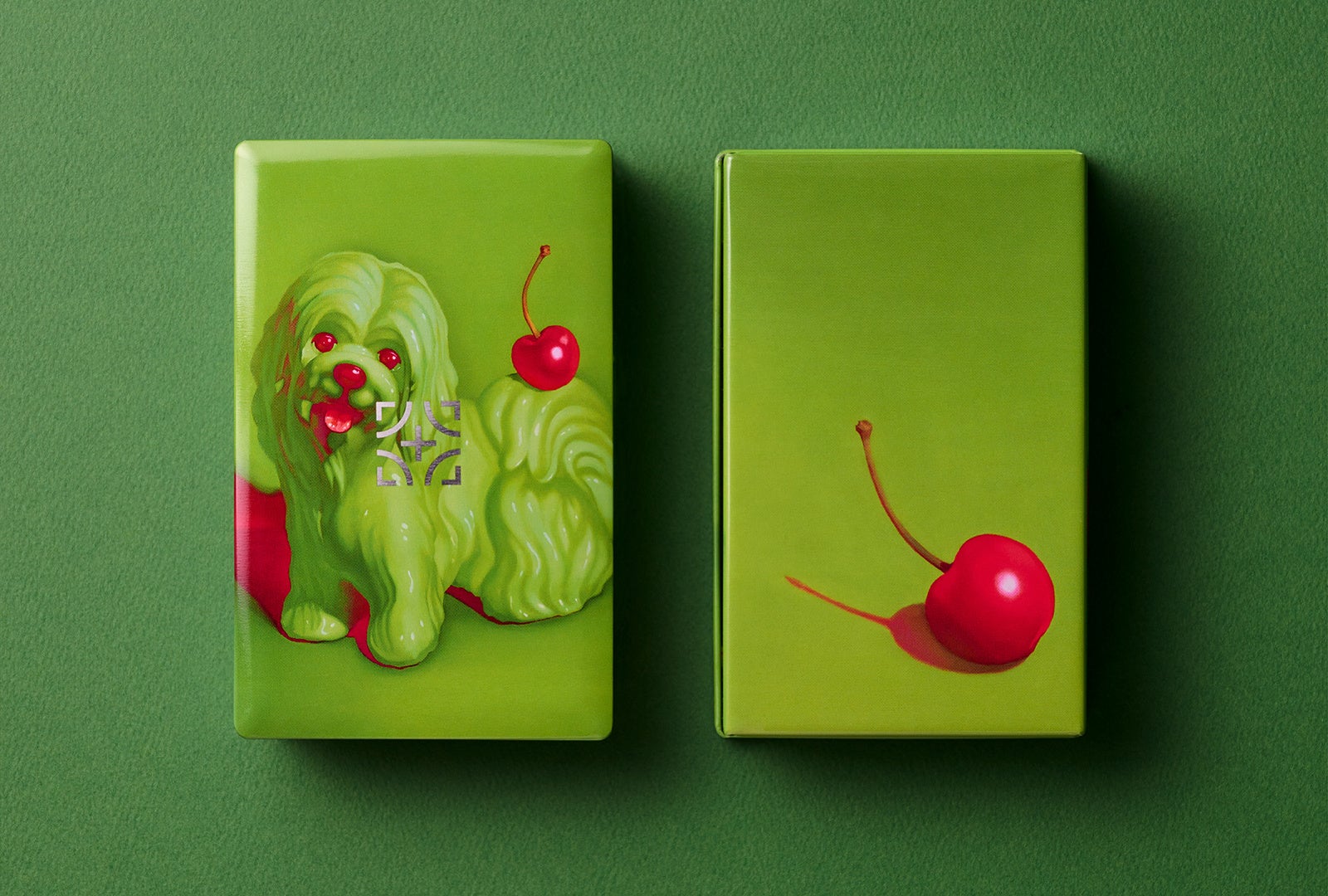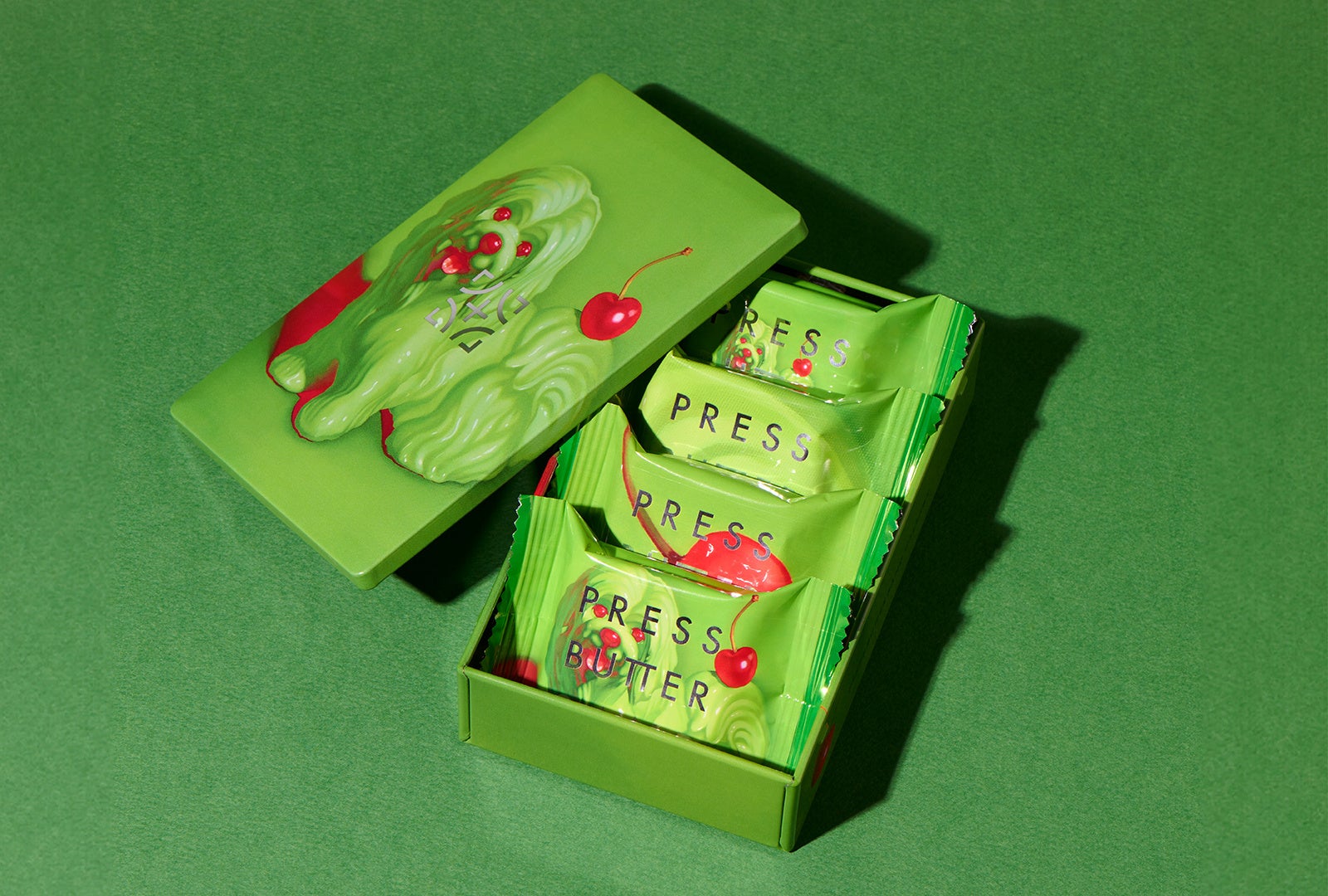 ピスタチオクリームをイメージした犬と、尻尾に乗ったチェリーは、おいしさが伝わるよう質感や艶にこだわって表現。ピスタチオとチェリーの味のイメージが直観に伝わるよう、黄緑とマゼンタ、2色の組み合わせで描きました。犬と目が合った時に、思わず手にしたくなるような愛嬌のある表情を意識しています。