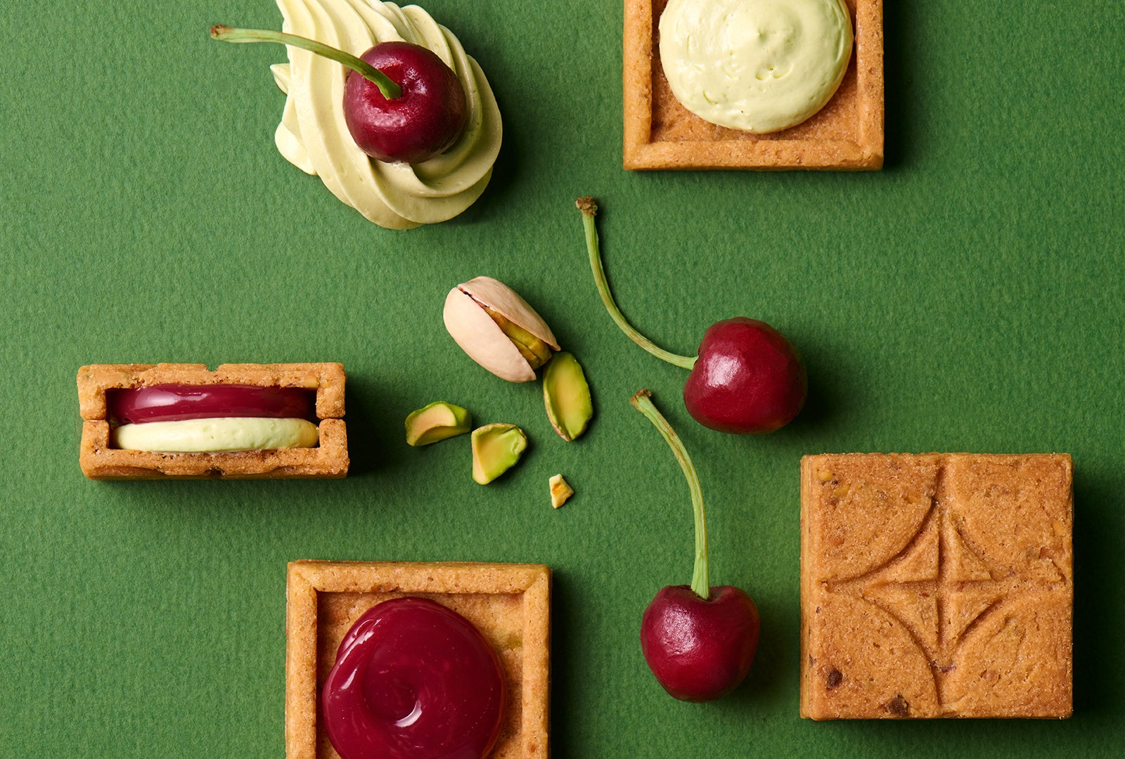 ピスタチオを練りこんだサクサクのクッキーに、香ばしいピスタチオバタークリームと、鮮やかな色合いの甘酸っぱいチェリーキャラメルをサンド。まるでケーキのような、贅沢感のあるバターサンドに仕上げました。