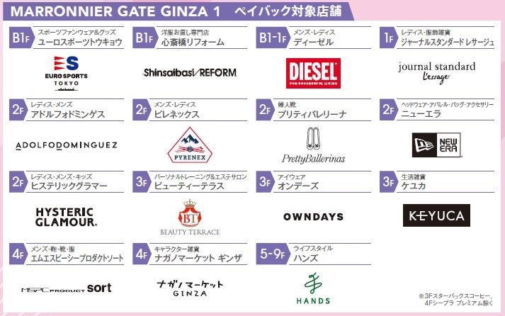 マロニエゲート銀座1 B1F~9F全店舗(3Fスターバックスコーヒー、4Fシープラプレミアム除く)