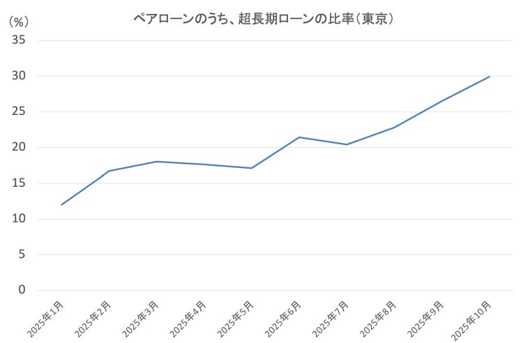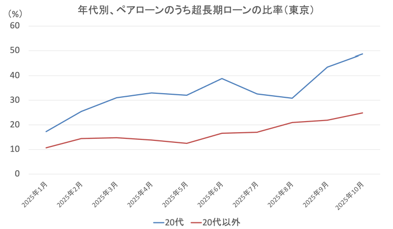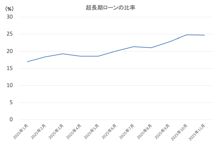超長期ローン(返済期間35年超)で借りる人の割合が増加しています。金融機関から相次いで50年ローンが投入されており、注目を集めています。利用者が増えているのは不動産価格の高騰が原因と考えられ、ペアローンと同様、さらなる不動産価格の高騰につながる可能性があります。