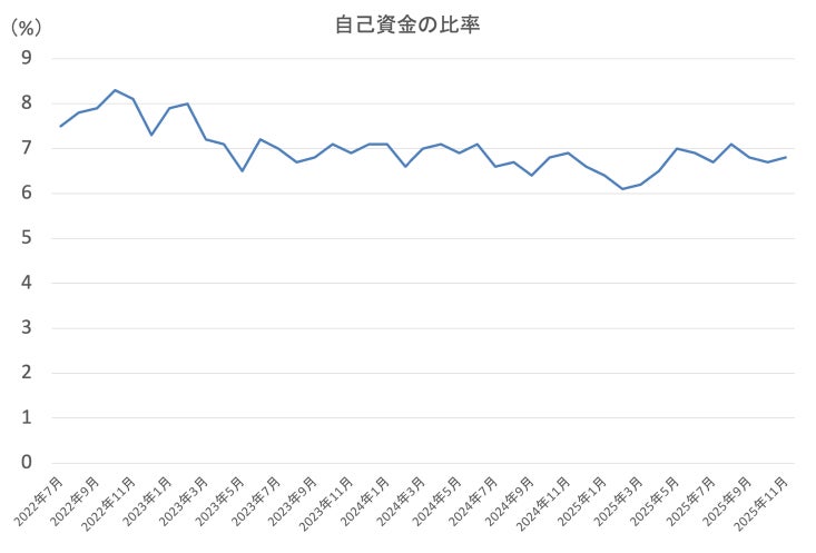 物件価格+リフォーム額+不動産諸費用+ローン諸費用の合計を総資金計画として、それに対する自己資金拠出の割合(%)を算出したところ、緩やかに低下し6〜7%程度となっています。インフレ環境下で、自己資金を温存し、できるだけ多く借り入れようとする動きが続いています。また、リフォーム費用や諸費用含めて融資できるよう、住宅ローンの商品改善がなされてきていることから、今後も低水準で推移するものと考えられます。