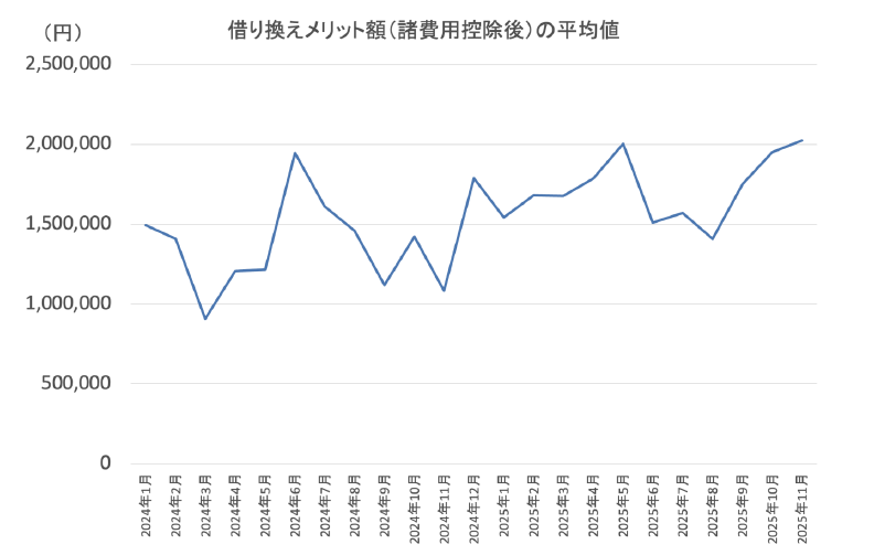 借り換えメリット額(諸費用控除後)ですが、利上げの影響があるものの、10月以降は再び拡大しています。各銀行の変動金利引き下げキャンペーンを受け、従来よりもメリットが出やすくなっている状況です。