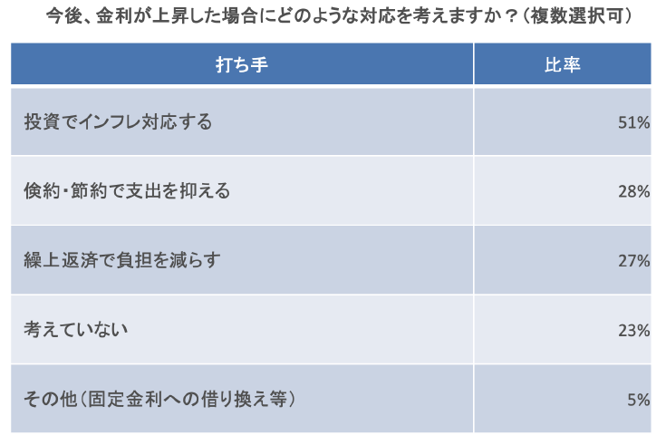 金利上昇への対策ですが、倹約・節約という従来の手法以上に、投資で対応する人の方が多い状況です。インフレで株価が堅調に推移する今、株式投資を検討する人が増えているものと考えられます。なお、モゲチェックのユーザーの中には「住宅ローンを借りている銀行の株式を買う」といったことを実践されている方もいます。