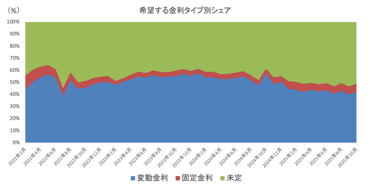 日銀の利上げを受け、最近は変動金利を希望するユーザーがやや減少し、未定(変動か固定か迷っている)という方が増えています。固定金利の希望の増加はまだわずかな動きです。未定ユーザーの多くは変動金利を選ぶため、変動人気はまだ続いているものと考えられます。