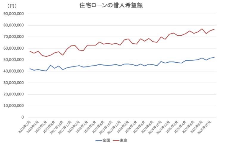 不動産価格の高騰を受け、住宅ローンの借入希望額は増加の一途を辿っています。特に東京都では、平均借入額が8,000万円近くになっています。高市政権は金融緩和的な政策を取るものと考えられ、今後も不動産価格は上昇する可能性が高く、それに合わせて借入希望額も増えるものと考えています。