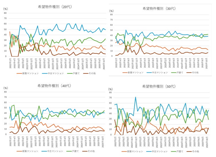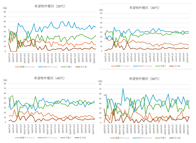 希望する物件種別を年代別に調査しました。20代は中古マンションの比率が高い状態が続いています。部屋数が必要ではなく、利便性や売却のしやすさから選ばれているものと考えられます。一方、30代以降は戸建てニーズも多くなっています。家族が増え、郊外に広い家を求める動きがあるものと考えられます。なお、新築マンションのニーズはどの年代も、年々低下傾向が見られます。価格高騰や供給戸数の減少が原因と考えられます。