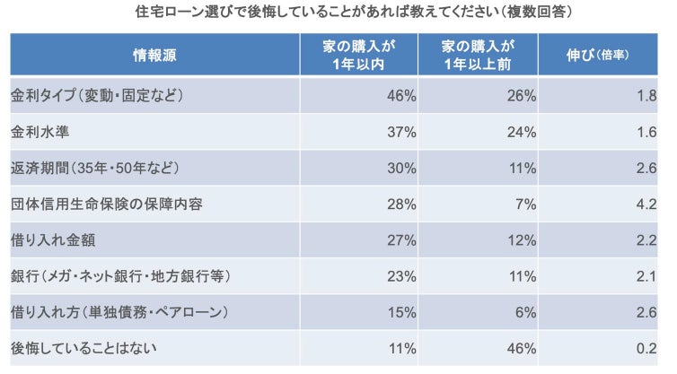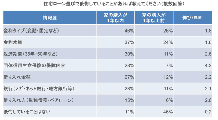 直近で家を購入した人のうち、後悔していない人はわずか1割にとどまりました。後悔の多くは金利関連に集中しており、金利タイプ(変動/ 固定)や金利水準に関するものが多いです。また、返済期間に対する後悔も多いようです。