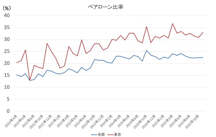 不動産価格の高騰を受け、ペアローンで借りる人の割合が増加しています。特に東京では35%近くまで上昇しています。夫婦世帯のうち共働き率は70%と言われており、ペアローン比率はまだ増加する可能性があります。また、ペアローン比率が高まると、さらに不動産価格が上昇する可能性があるでしょう。
