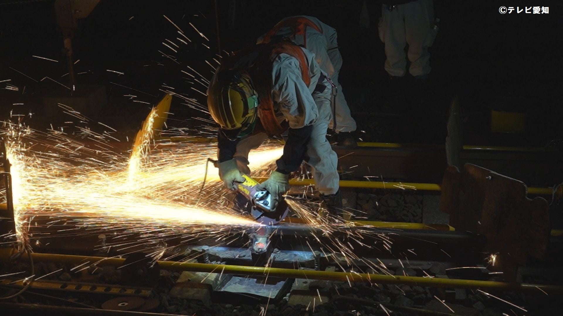JR尾張一宮駅近く。長さ350メートルものレールを深夜に交換。その場で切断するとナゾのマシンで一気にレールが!