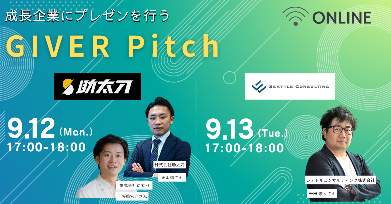 株式会社助太刀とシアトルコンサルティング株式会社に対する審査制・オンラインピッチイベントを9月12、13日に連日開催。