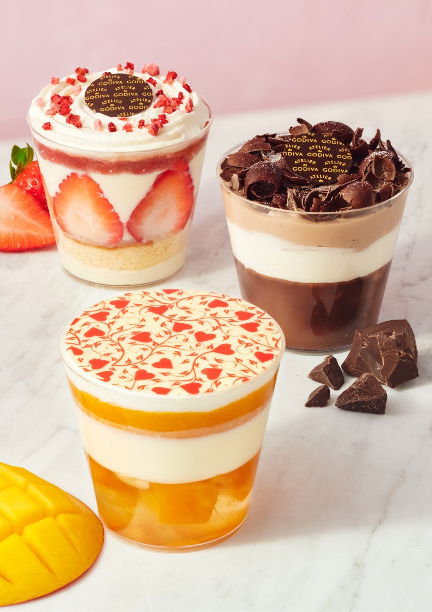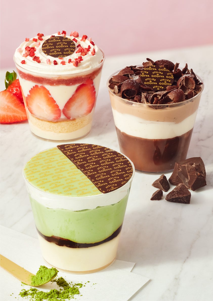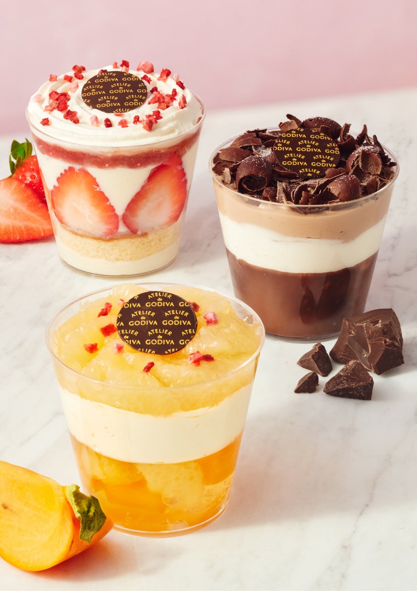 ATELIER de GODIVAのシェフがその手で作り上げる、お持ち帰り可能なパルフェ「アトリエ パルフェ アンポルテ」は、濃厚なカカオ67%チョコレートクリームを香ばしいナッツ類と合わせて敷き詰め、トップには口当たり軽やかなミルクチョコレートムースやホイップクリームをスポンジケーキと一緒に組み合わせた、贅沢かつ食べやすい『アトリエ パルフェ アンポルテ ショコラ』、カップを囲むようにデコレーションされた苺が可愛らしい『アトリエ パルフェ アンポルテ ストロベリー』の2種類と、西武池袋本店限定の『アトリエ パルフェ アンポルテ マンゴー』、大丸京都限定の『アトリエ パルフェ アンポルテ 抹茶』、博多阪急限定の『アトリエ パルフェ アンポルテ グレープフルーツ&柿』の全5種類をラインナップしました。