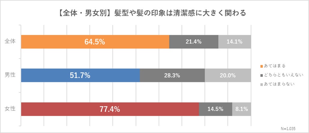 男女1,035人に対して実施した調査で、「髪型や髪の印象は清潔感に関わる」と回答したのは全体で64.5%にのぼりました。中でも、女性全体では77.4%に達する一方、男性は51.7%にとどまっており、女性の方が髪に対する印象意識が圧倒的に高いことが明らかになりました。