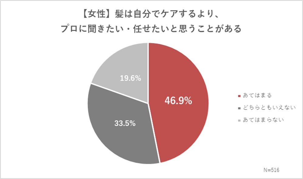 さらに、「髪は自分でケアするより、プロに聞きたい・任せたいと思う」と回答した女性は46.9%と約半数にのぼり、「何から始めればいいか分からない」「情報が多すぎて選べない」「正しくできている自信がない」といった、知識・手段・自信の不足による心理的ハードルがあると考えられます。そこに、専門的なサポートやカウンセリングを求めるニーズも潜在的に存在していることがうかがえます。
