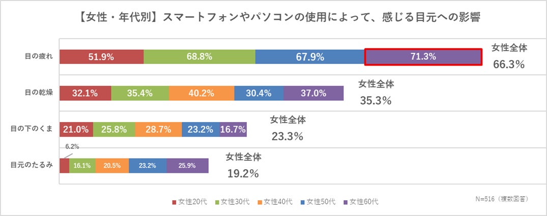 女性の66.3%が「目の疲れ」、35.3%が「目の乾燥」、23.3%が「目の下のくま」を感じると回答。