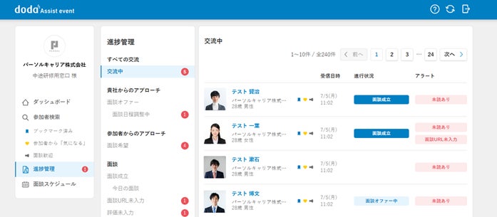 | ① 参加者情報やスケジュールの管理がしやすい ・面談時に個別で取得し、独自管理が必要だった転職希望者の情報は、 採用管理システム「doda Assist」*に自動連携されるようになり、管理が簡単に。 ・システム上で面談日時の調整が可能。進捗情報も一目でわかり、採用活動がよりスムーズに。 ② 自社のニーズに合う人材を見つけやすい ・転職希望者が「doda」に登録した情報を閲覧可能にすることで、自社が求める人材を 探しやすい上、企業が転職希望者へ「面談オファー」を送ることも可能に。 ③ 再出展しやすい ・情報連携により、過去出展時の情報を引き継げるため大幅に工数を削減。 |
