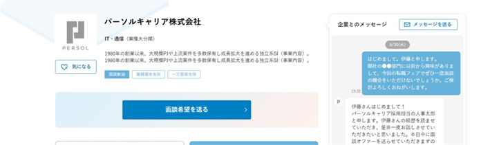 | ① イベントに参加しやすい ・「doda」会員情報を連携することで、参加エントリーのたびに入力が必要だった 職務経歴書などの情報が入力不要に。エントリー時の手間が省け簡単に参加できる。 ② 自分に合う企業を見つけやすい ・自身の経歴が企業の面談希望条件と合致した場合、画面上に「面談歓迎」のアイコンが 表示されるようになり、自分に合う企業が一目でわかるように。 ③ 企業に自分をアピールしやすい ・気になる企業に「面談リクエスト」ボタンを押すだけで、面談意志を伝えることが可能に。 |