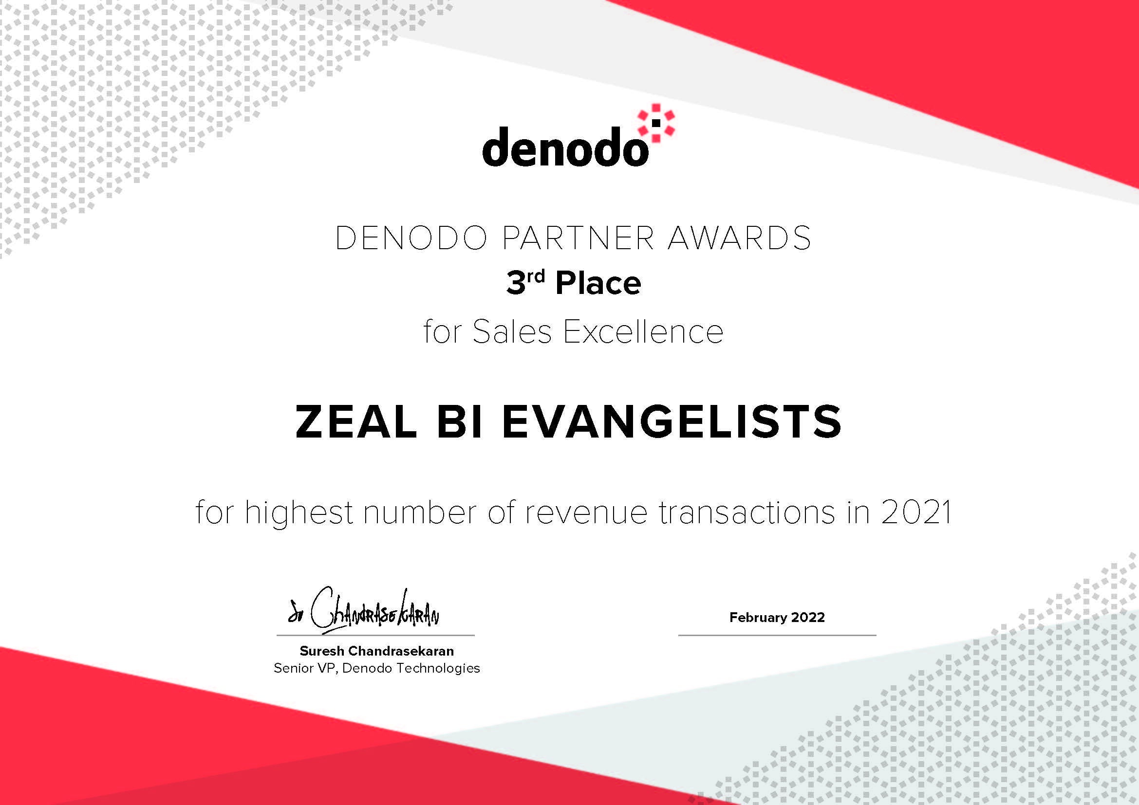 Denodo Technologies株式会社(以下:Denodo)主催のDENODO PARTNER AWARDS 2022 にて、ジールが昨年度の取引実績がグローバル3位となり、国内のDenodoパートナーで唯一「セールスエクセレンスアワード」を受賞したことを発表いたします。