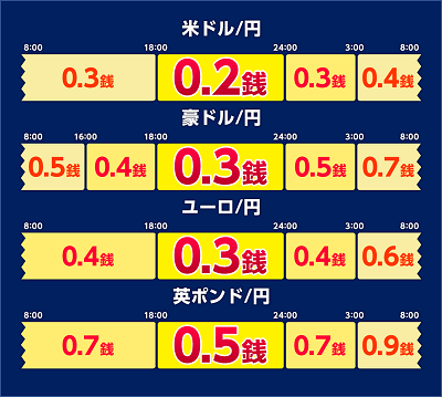 ※主要経済指標発表時等の急変時、国内外の休日や平日早朝など著しい流動性低下時はやむをえずスプレッドを拡大する場合がございます。