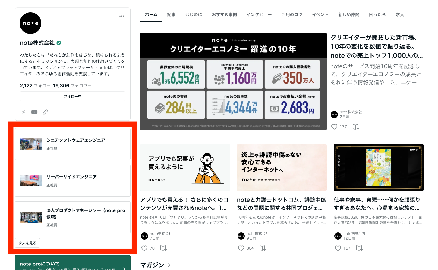 note pro利用企業は、新設された「求人」タブを活用して、自分たちのnoteアカウントに募集中の求人票の一覧を公開できるようになりました。現在はHRMOS採用を利用している企業が対象となりますが、今後は連携先を増やしていきます。