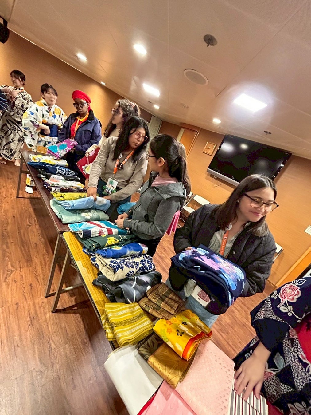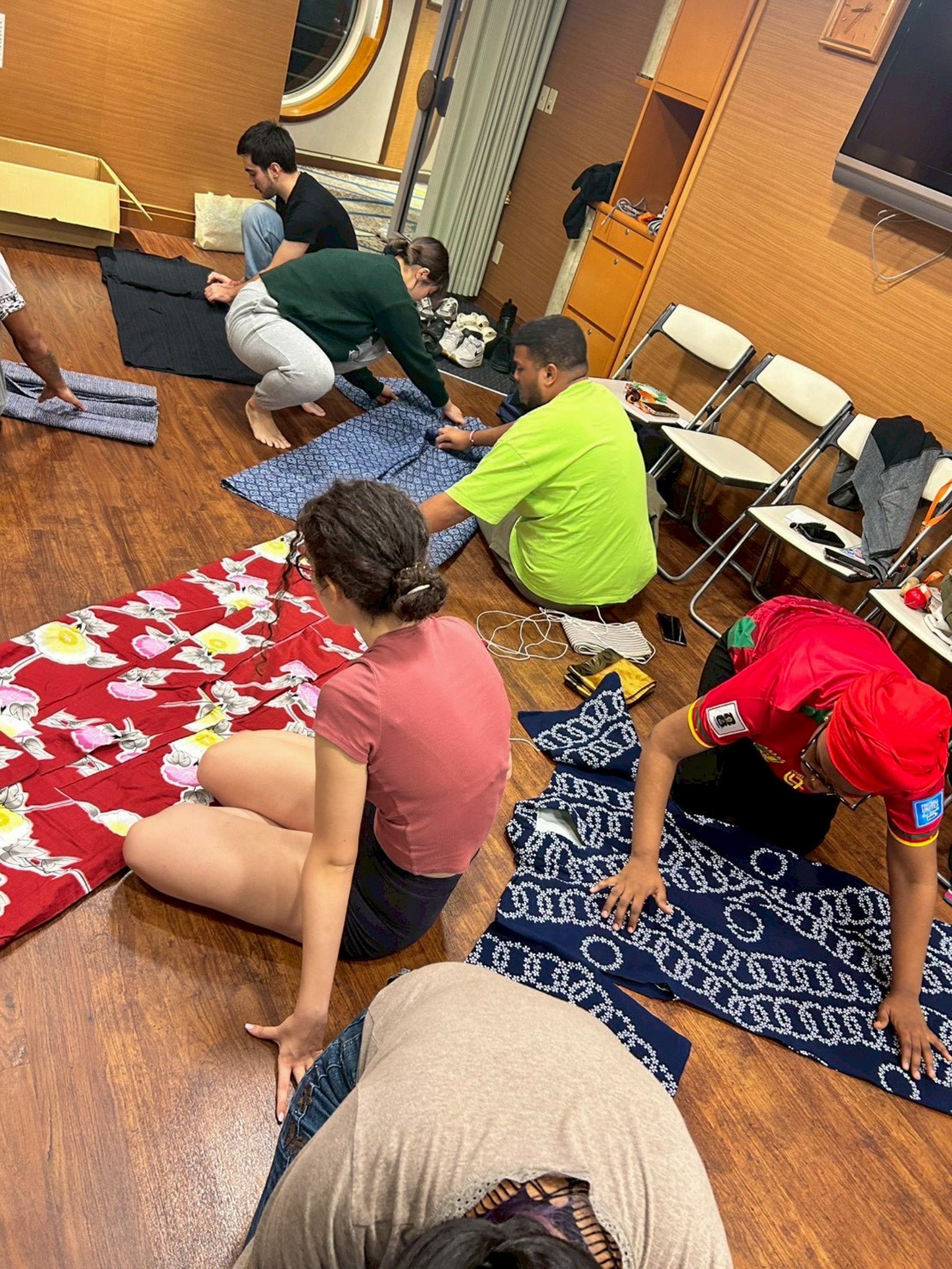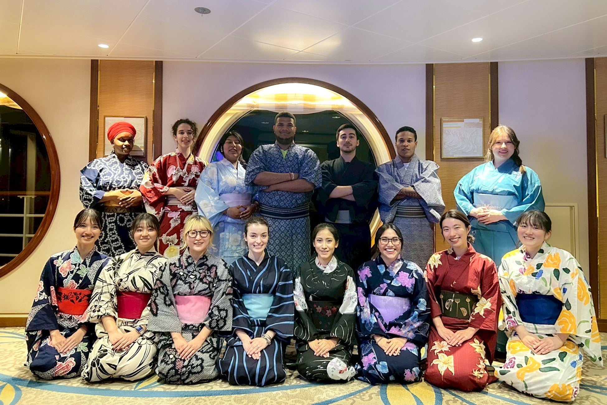 この事業内の船上イベントのひとつとして、船内にいながらも文化交流の場を作るため「浴衣体験教室プロジェクト」が企画されました。日本を訪れたことがない外国人青年にも、日本の伝統衣装のひとつである浴衣を体験してもらい、日本文化への興味と理解を促進することを目的とするものです。