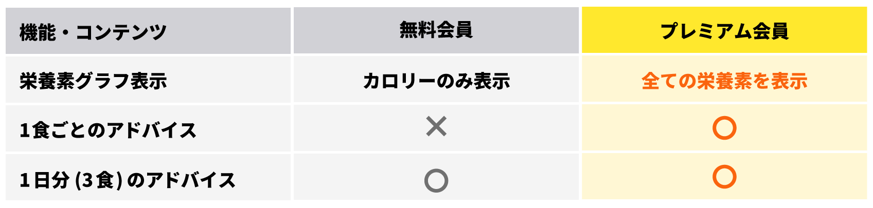 管理栄養士から毎日健康に関するアドバイスが届きます。1日の栄養バランスに関してのアドバイスと★5段階で健康度が表示されます。さらにプレミアム会員は1食単位の栄養アドバイスを受けることができます。