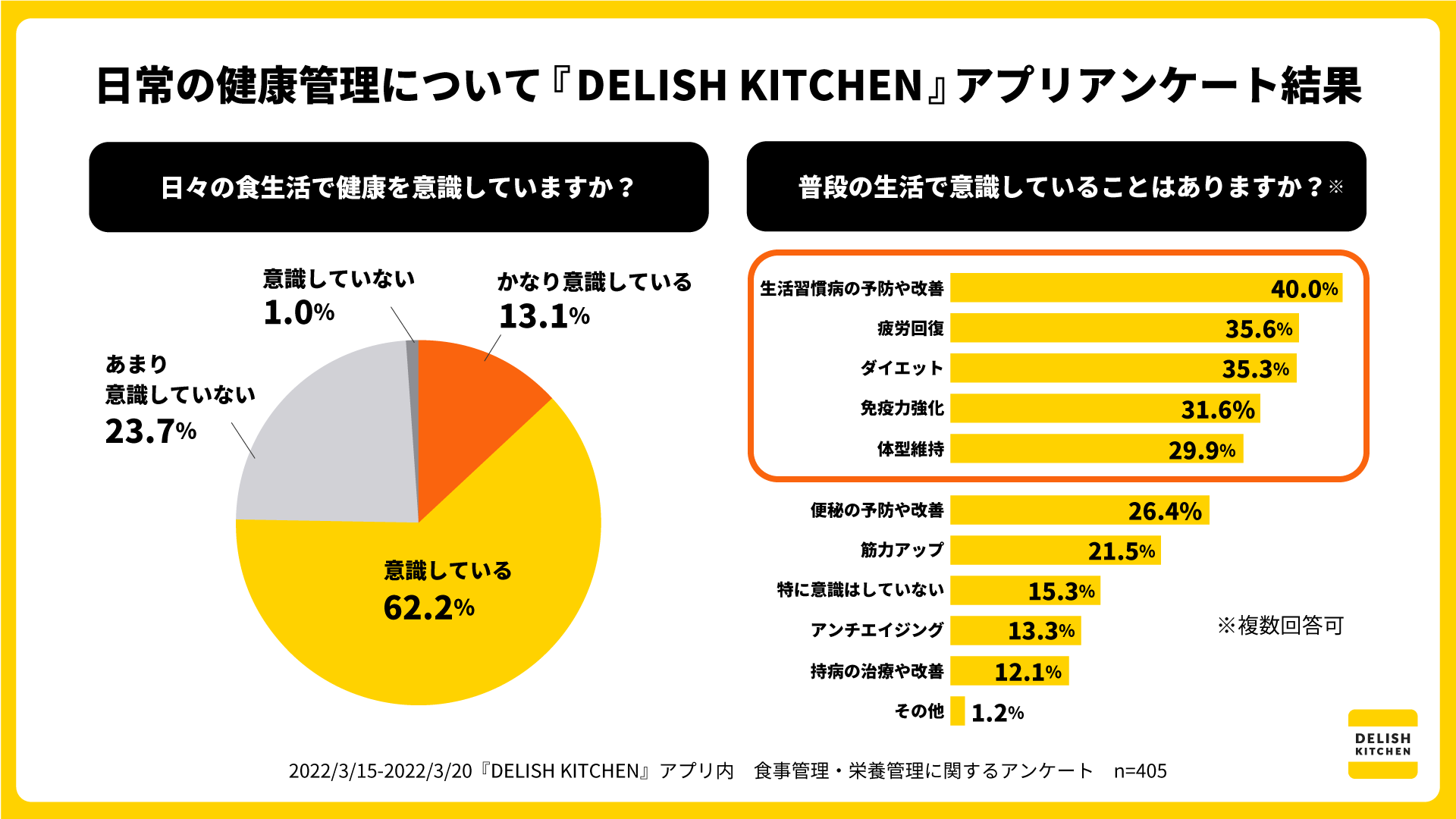 『DELISH KITCHEN』が定期的に行っているユーザー調査では、75%以上の人が「日々の食生活で健康を意識している」と回答。また、普段の生活の中で意識しているのは「生活習慣病の予防や改善」「疲労回復」「ダイエット」など、健康増進に関心の高い人が多くなっています。しかしながら、ユーザーインタビューを通じてわかってきたことは、家族の健康を考え栄養バランスを重視した献立を作りたいと思っていても、具体的にどうすれば良いのかわからず行動変容を起こすには大きなハードルがあるということです。