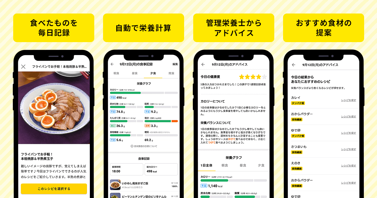 アドバイスに基づいて、栄養バランスがより良くなる食材を提案。食材から『DELISH KITCHEN』のレシピを探すことができ、1日の栄養バランスを整えることができます。