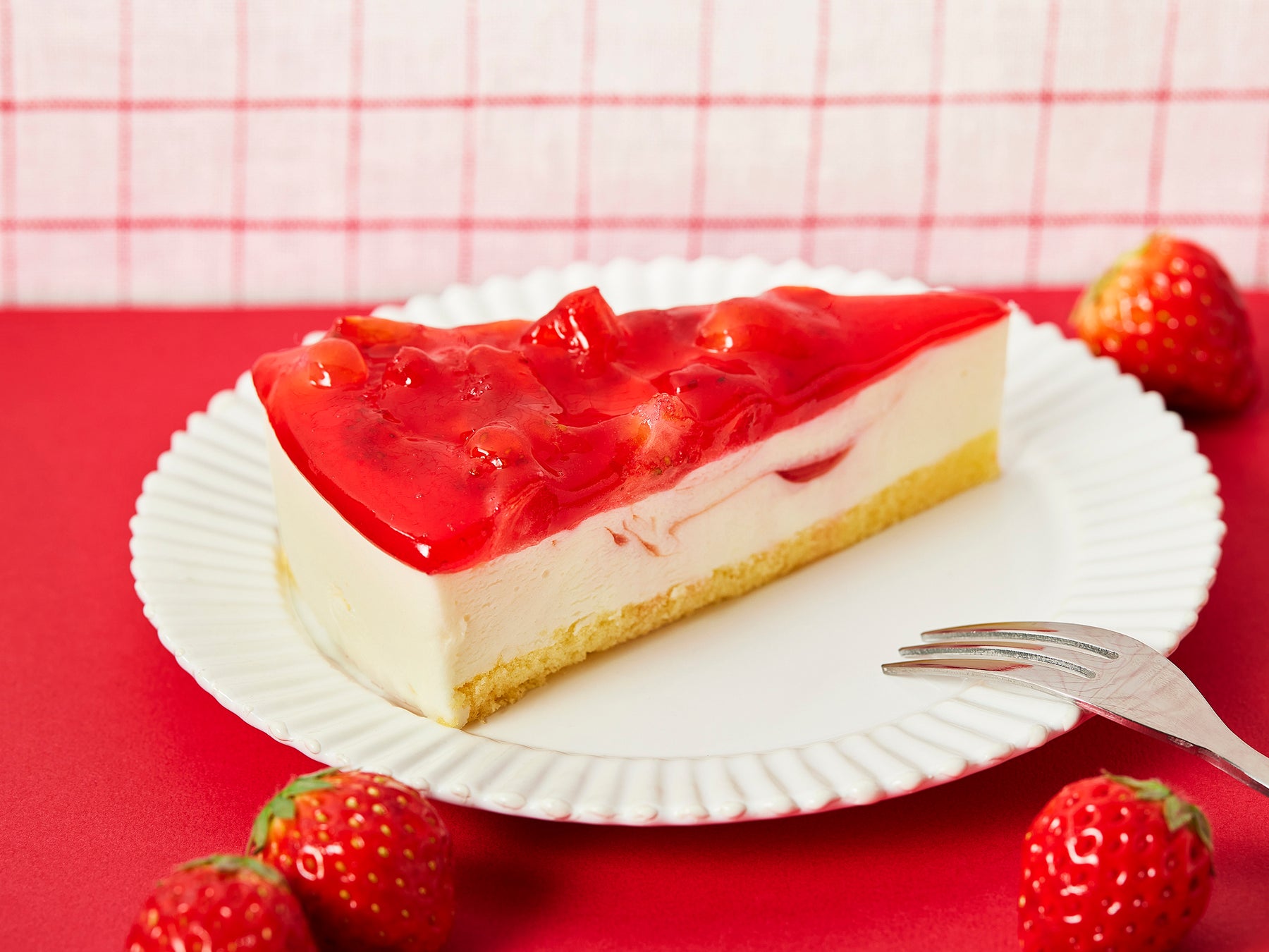 苺ソースを混ぜ込んでいる滑らかでクリーミーな味わいのレアチーズケーキに、苺果肉と透明にきらめく苺ジュレの組み合わせがマッチしたチーズケーキです。軽やかな口当たりと舌の上で溶けるような食感をお楽しみいただけます。