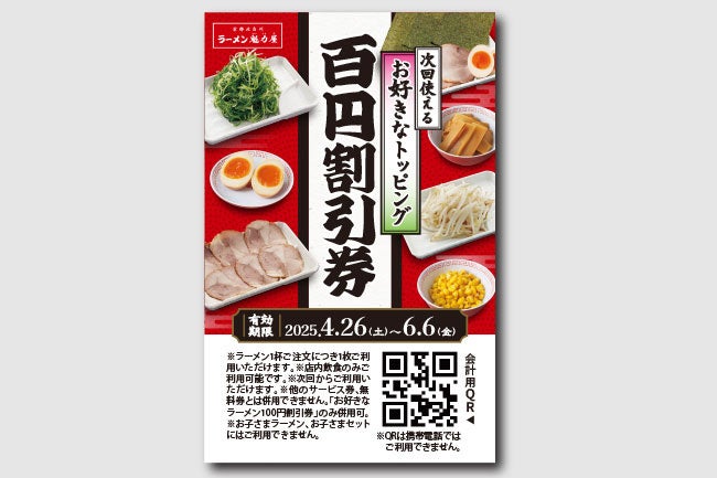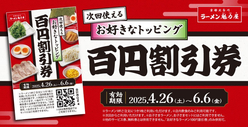 各種トッピングを100円割引でお楽しみいただける、「お好きなトッピング100円割引券」を2025年4月26日(土)より配布いたします!※2025年4月26日(土)~6月6日(金)でご利用可能です。