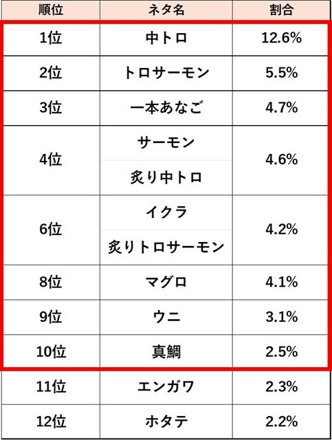 また、トロサーモン、サーモン、炙りトロサーモンと、サーモン系のネタが複数ランクインしており、安定した人気を集めています。