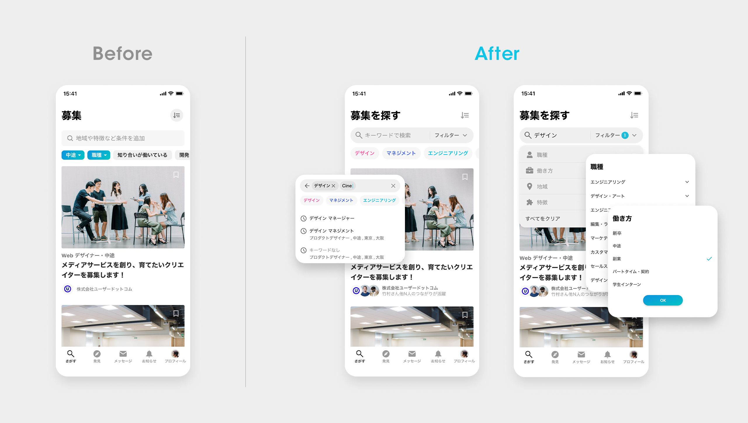 今回のリニューアルでは、検索画面のデザインを、よりモバイルに最適化した仕様へ変更しました。デザイン変更によって、Wantedly Visitのアプリ上で検索がしやすくなり、一人ひとりに最適な募集を見つけていただきやすくなります。