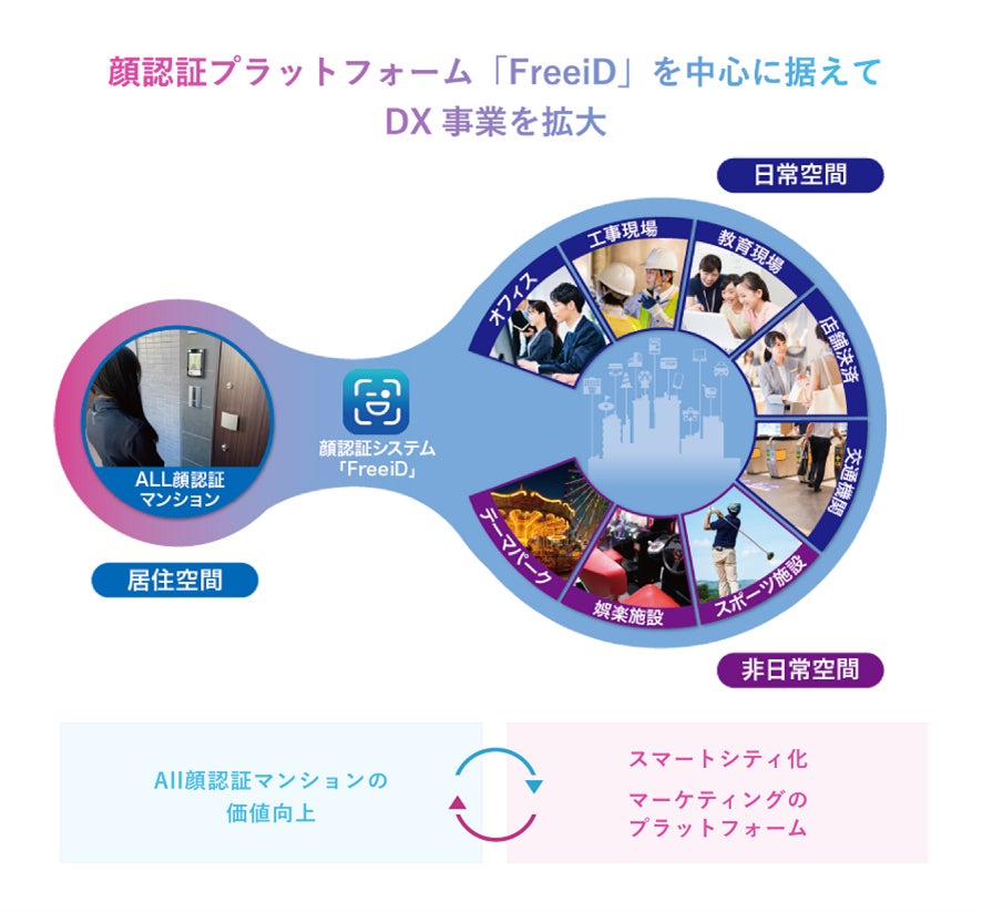 当社グループは顔認証システム「FreeiD(フリード)」を開発し、2021年1月より当社開発マンションでの全面導入を実施し、2022年からは他社マンションに向けた導入も行っており、2023年早期に賃貸管理会社に対する公開も実施予定です。今後も「FreeiD」を既存事業・新規事業に展開しDX事業の拡大を行っています。既存不動産事業の付加価値を高めた「ALL顔認証マンション」と「顔認証IDプラットフォーム」によるスマートシティ構想を進めており、この両軸を推進することで「ALL顔認証マンション自体の付加価値」をさらに高める取り組みを行っています。