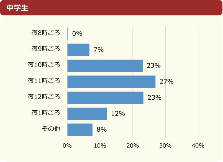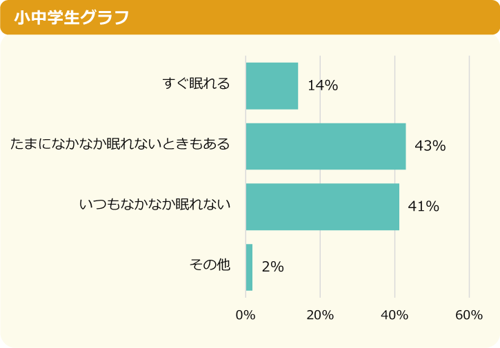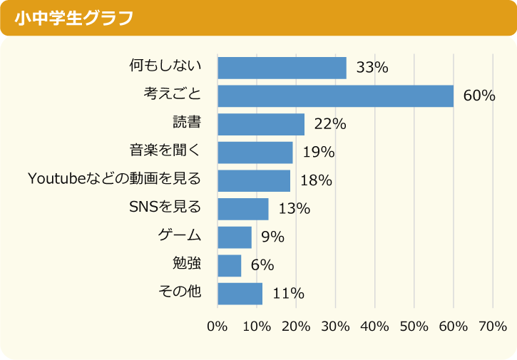 布団に入ってから眠るまでの行動として、最も多かったのが「考えごと」で、小中学生の60%を占めていました。次いで多かったのは「何もしない」の33%、その次が「読書」の22%、4位以降は「音楽を聞く」「YouTubeなどの動画を見る」「SNSを見る」と続きました。