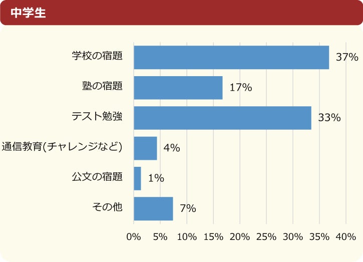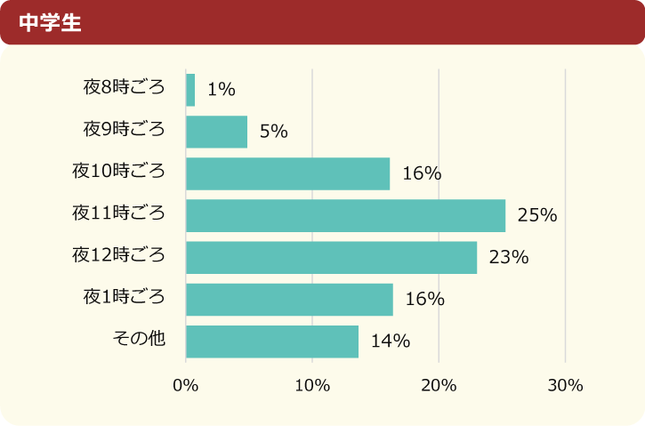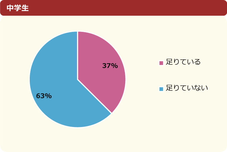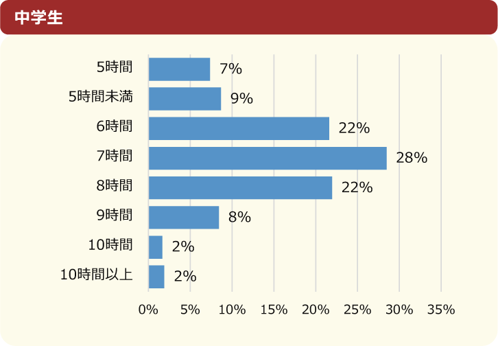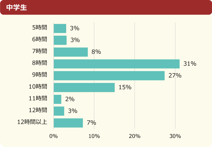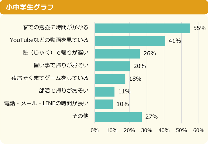 平日の夜は「夜10時頃」に寝る人が30%と最も多く、休日の夜は「夜11時頃」に寝る人が25%、「夜10時頃」は24%と、休日は平日に比べて夜更かしする人が増えるようです。また「睡眠時間は足りている?」という質問では、全体の54%が「足りていない」と回答しており、足りていない理由を尋ねたところ、「家での勉強に時間がかかる」「YouTubeなどの動画を見ている」「塾で帰りが遅い」などが主な理由としてあがっていました。