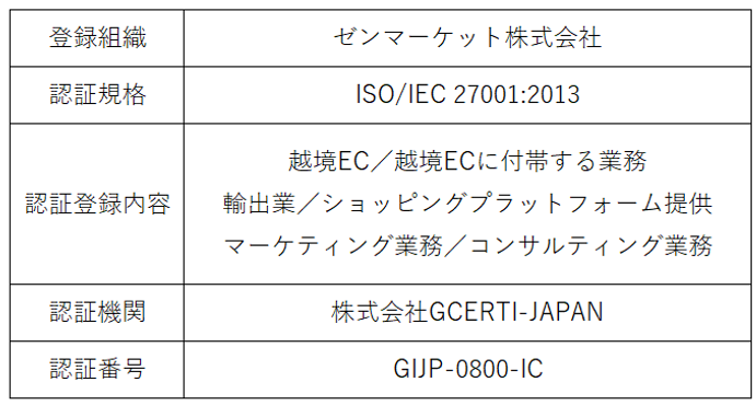 この度、ゼンマーケット株式会社は、 越境ECサービスをご利用いただく海外ユーザー様、そして日本の事業者様の信頼に足る会社であり続ける為、株式会社GCERTI-JAPANよるISMS認証を取得いたしました。今後もより一層、認証基準に基づいた情報セキュリティの管理体制を高いレベルでの維持、継続的な改善に取り組めるように努めてまいります。