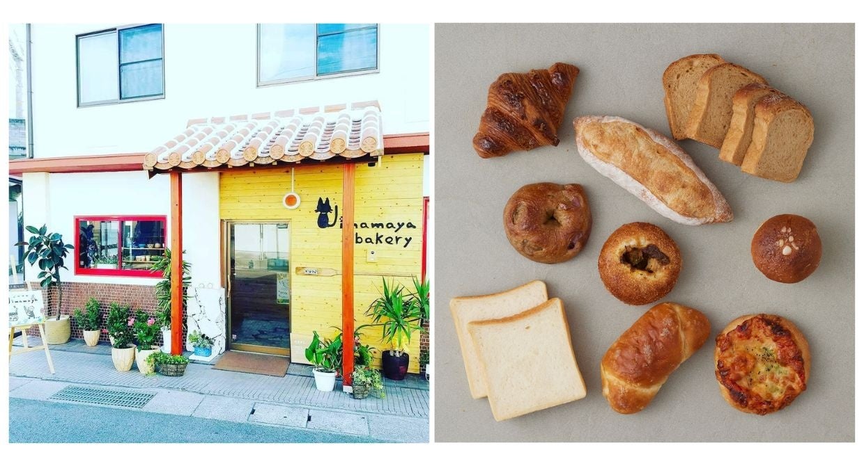 沖縄の陶器「やちむん」やジンベエザメの壁画が飾られた店内で、50種類以上の個性豊かなパンを提供。沖縄の食材を使った味わいが地元でも評判です。