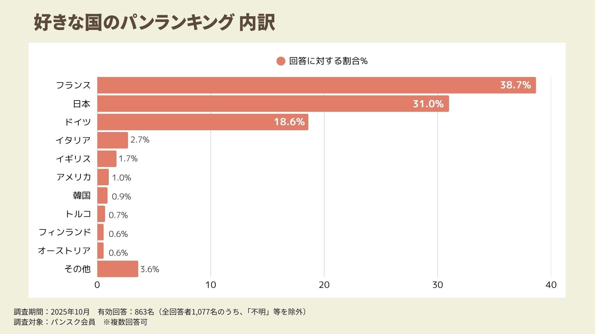 今回のアンケートは、その一環として「パンと国の関係性」に着目し、“どの国のパンが好きか”というテーマを通じて、パンに対する日本人の価値観や親しみを探る目的で実施しました。