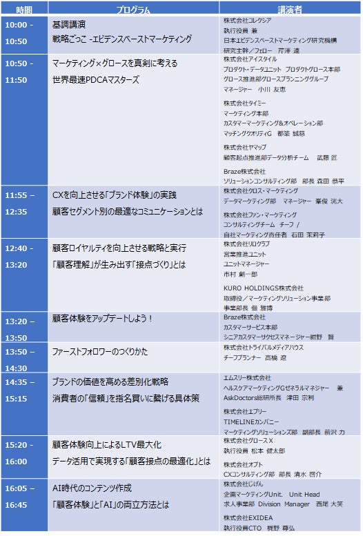 また、各社からはマーケティング×グロースを掛け合わせたPDCAの方法、ブランドの価値を高めるためのロイヤルティや差別化戦略、またAI時代におけるコンテンツ作成のあり方など、顧客エンゲージメントをアップデートさせるための戦略と施策展開までを詳しく解説します。