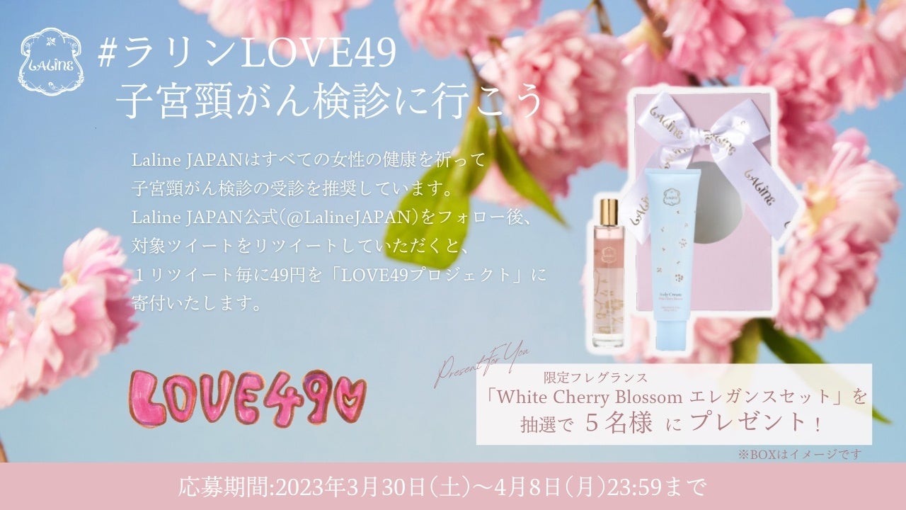 Laline JAPAN公式アカウント(http://twitter.com/LalineJAPAN)をフォロー後、対象ツイートをリツートいただくと、1リツイートにつき49円を「LOVE49プロジェクト」に寄付いたします。さらに参加いただいた方の中から抽選5名様に「White Cherry Blossom エレガンスセット」をプレゼントいたします。
