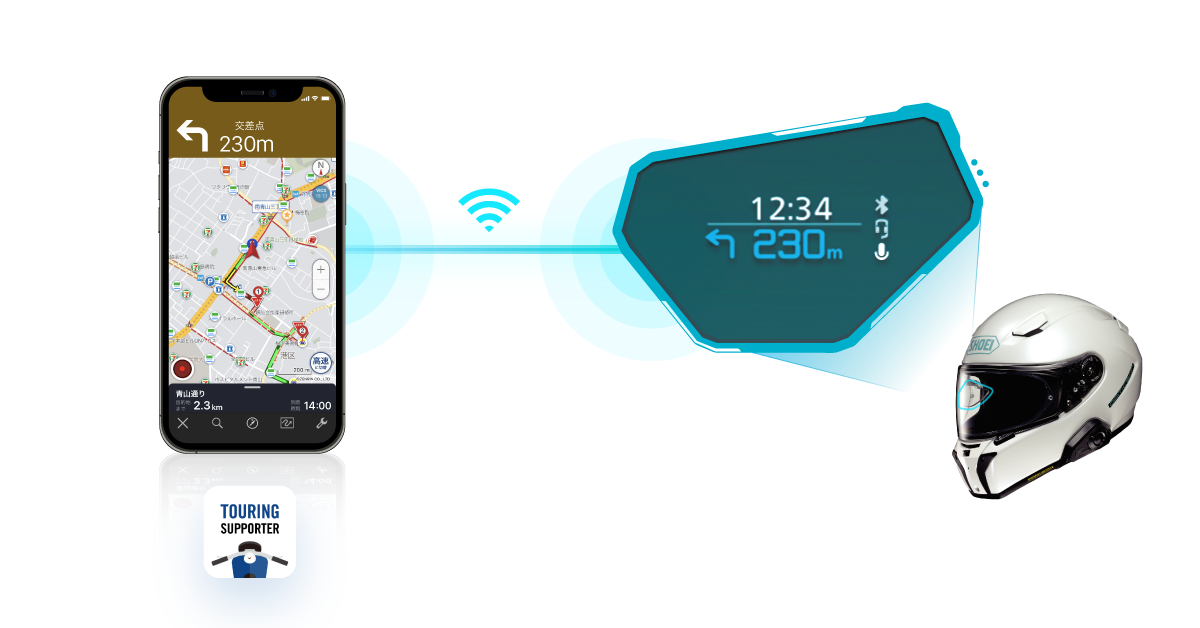 本対応により、スマートフォンと「OPTICSON」をBluetooth※で接続させると、『ツーリングサポーター』のナビゲーション情報がヘルメットのディスプレイに映し出されます。