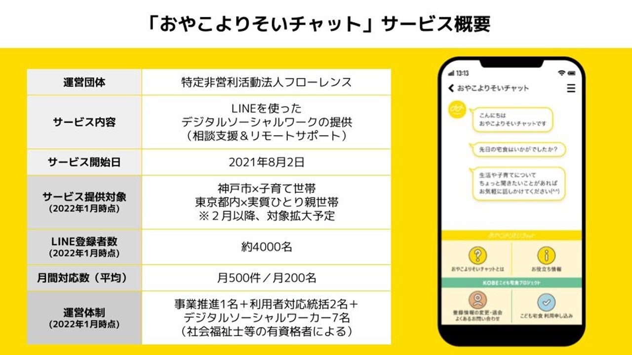 デジタルソーシャルワークとは、オンラインで可能な支援を提供しながら、継続的に声をかけ、ゆるやかに雑談・相談を受けながら、自然な流れで情報提供・支援へつなぐ新しい支援のモデルです。2021年8月より神戸市と協力して開始した「おやこよりそいチャット」では、現在約4,000名がLINEに登録しており、有資格者の相談員(デジタルソーシャルワーカー)が月に平均500件以上、200名以上とやり取りをしながら、必要な支援につないでいくデジタルソーシャルワークを実践しています。