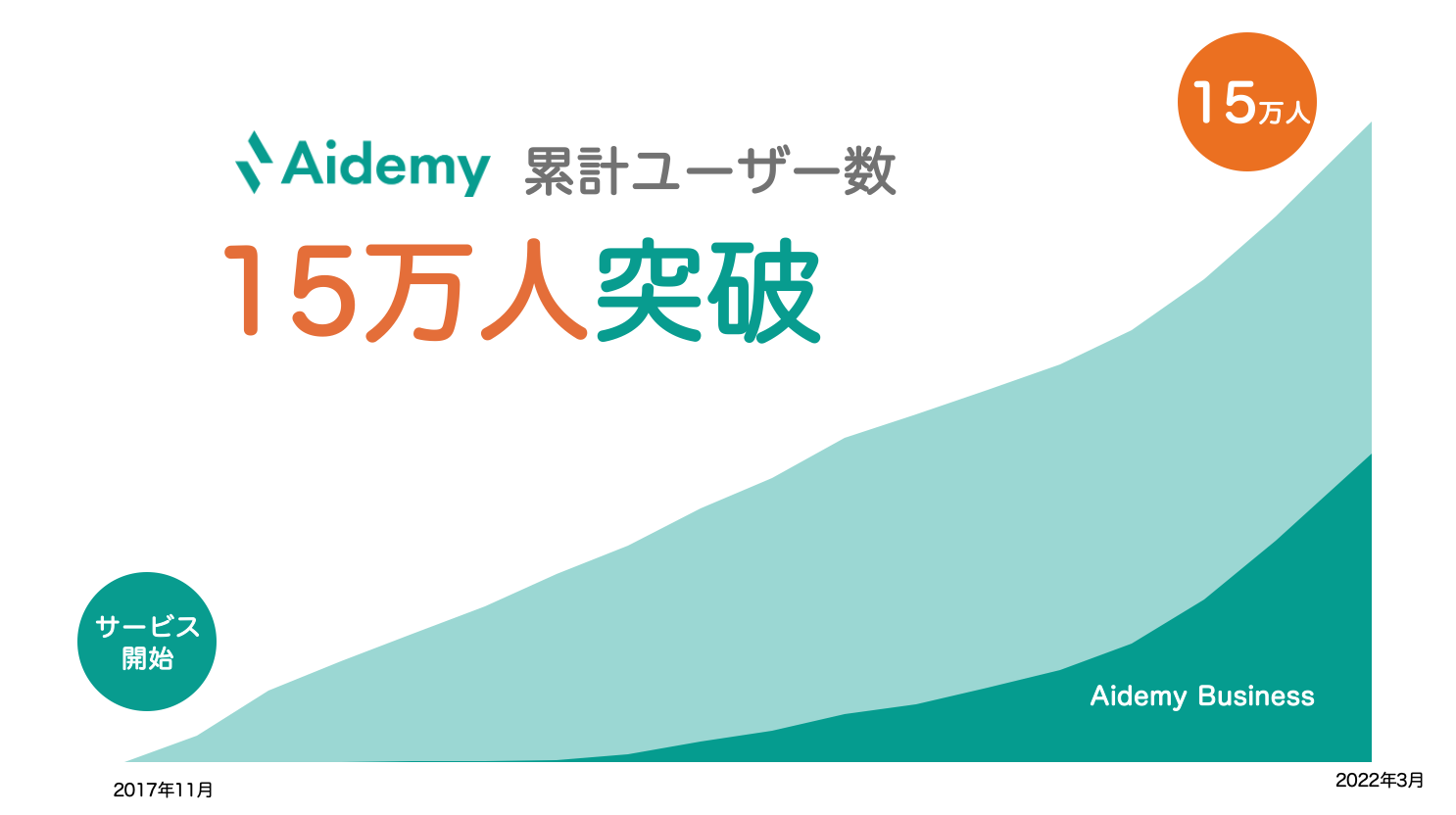 Aidemyは2017年12月にサービスローンチし、約3ヶ月後の2018年3月には1万人のユーザー数を記録、その後2021年2月に10万人に到達しました。