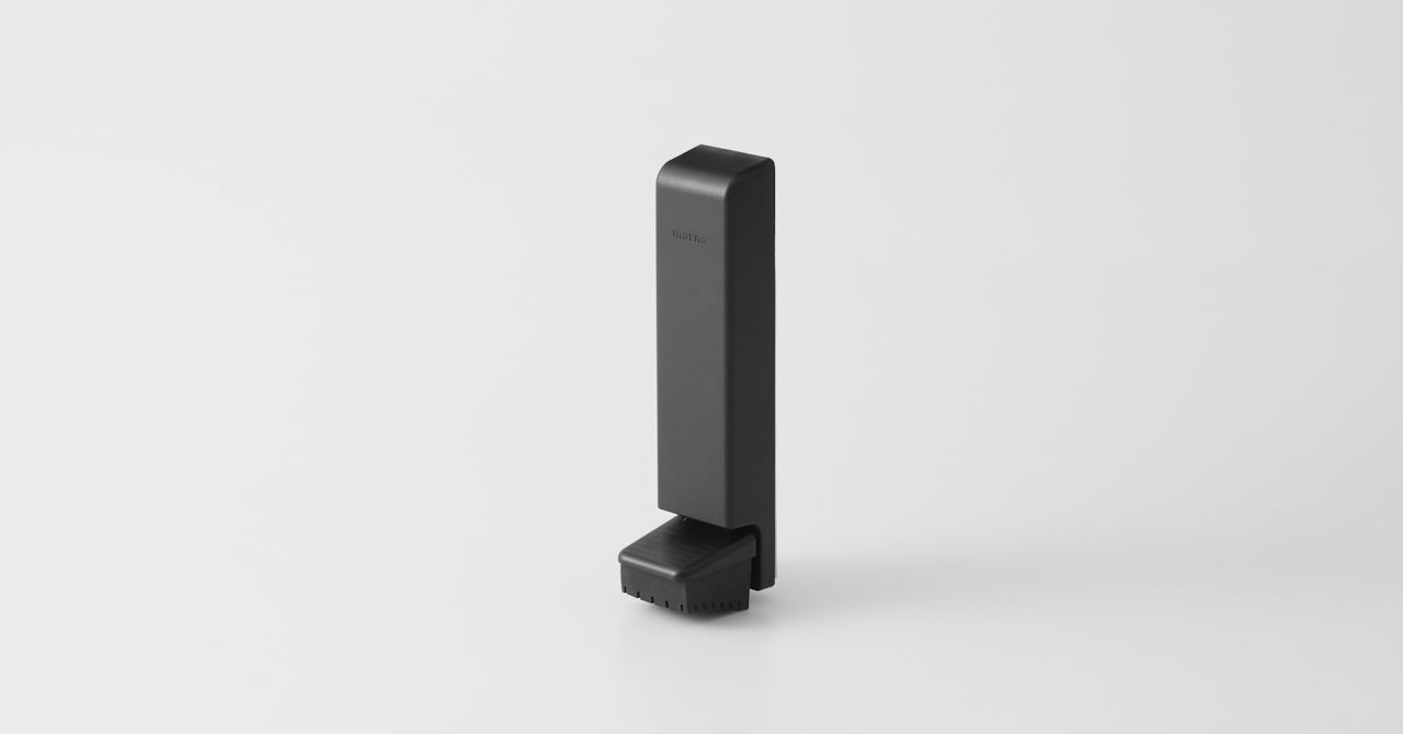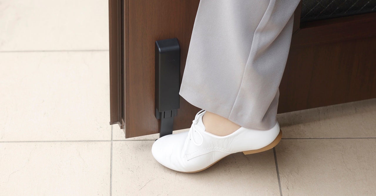 「ドアストッパー」は、マグネットでドアに取り付けられ、固定も解除もスムーズにできるドアストッパーです。固定は本体下のペダルを足で踏み込むだけ。タイヤから着想を得た溝のパターンと弾力性のあるゴムで地面に密着、しっかり止まります。解除は、ドアを外側に軽く押すだけ。バネの力でペダルが上がり、ストッパーに直接触れずに一瞬で解除できます。