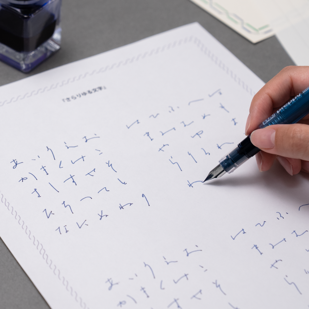 ひらがなの50音とアルファベットの26文字に加えて、毎日のくらしで使えるひとことフレーズを練習します。万年筆をつかって見本をなぞり書きするスタイルなので、写経のような感覚で無心になって没頭できます。
