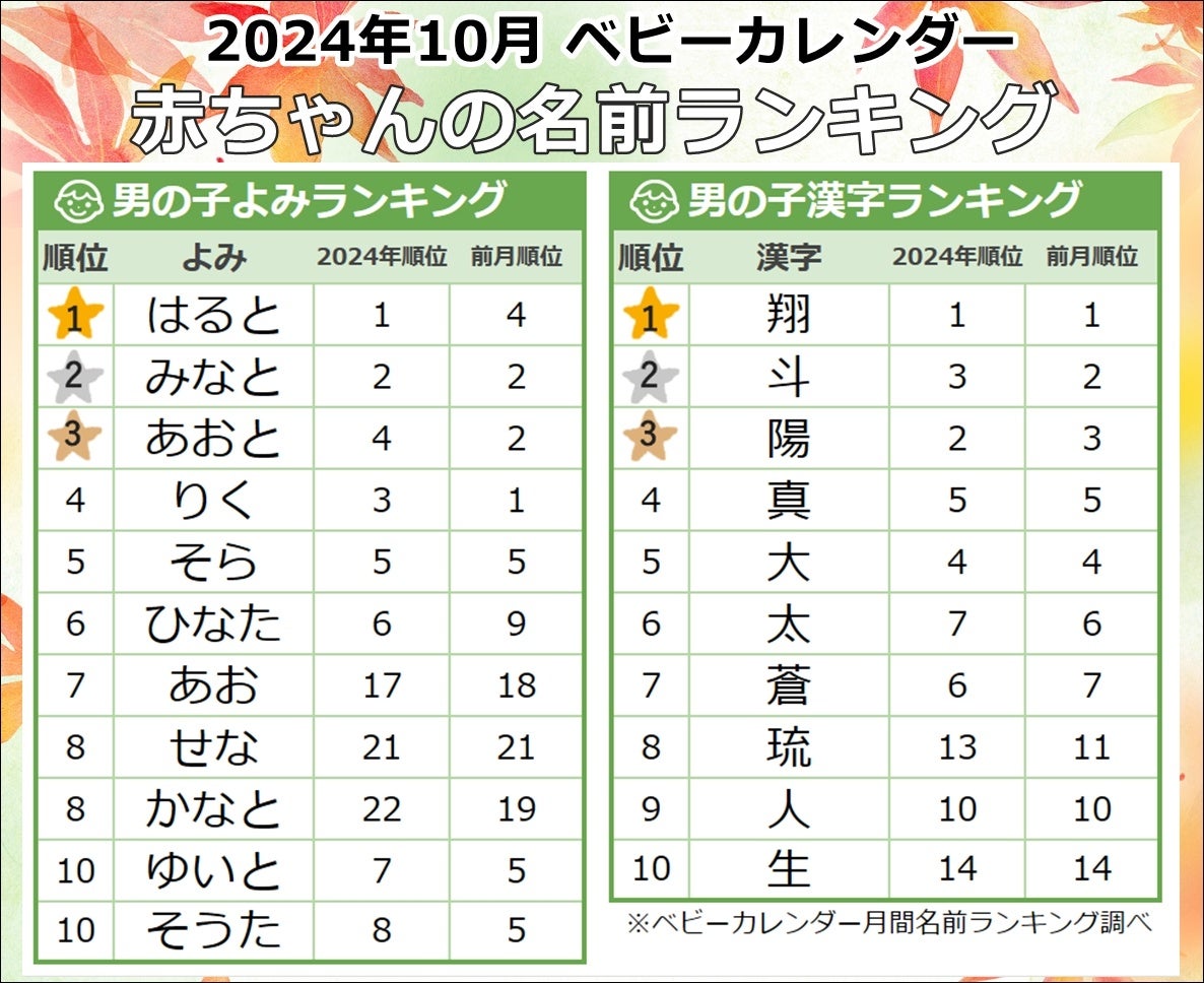 男の子の名前ランキングでも、「楓(主なよみ:かえで)」が9月の42位から10月には4位に急上昇。「楓真(主なよみ:ふうま)」は前月と変わらず14位と高い順位を維持しています。また、「琉楓(主なよみ:るか)」・「楓大(主なよみ:ふうた)」・「楓人(主なよみ:ふうと)」はランキングTOP100位圏外から47位(※同率)にランクアップしており、「楓太(主なよみ:ふうた)」もTOP100圏外から63位に上昇しています。男女どちらも「楓」を用いた名前が増加したことから、「楓」を含む「メープルネーム」が10月生まれの赤ちゃんの名付けで特に人気を集めたことが分かります。