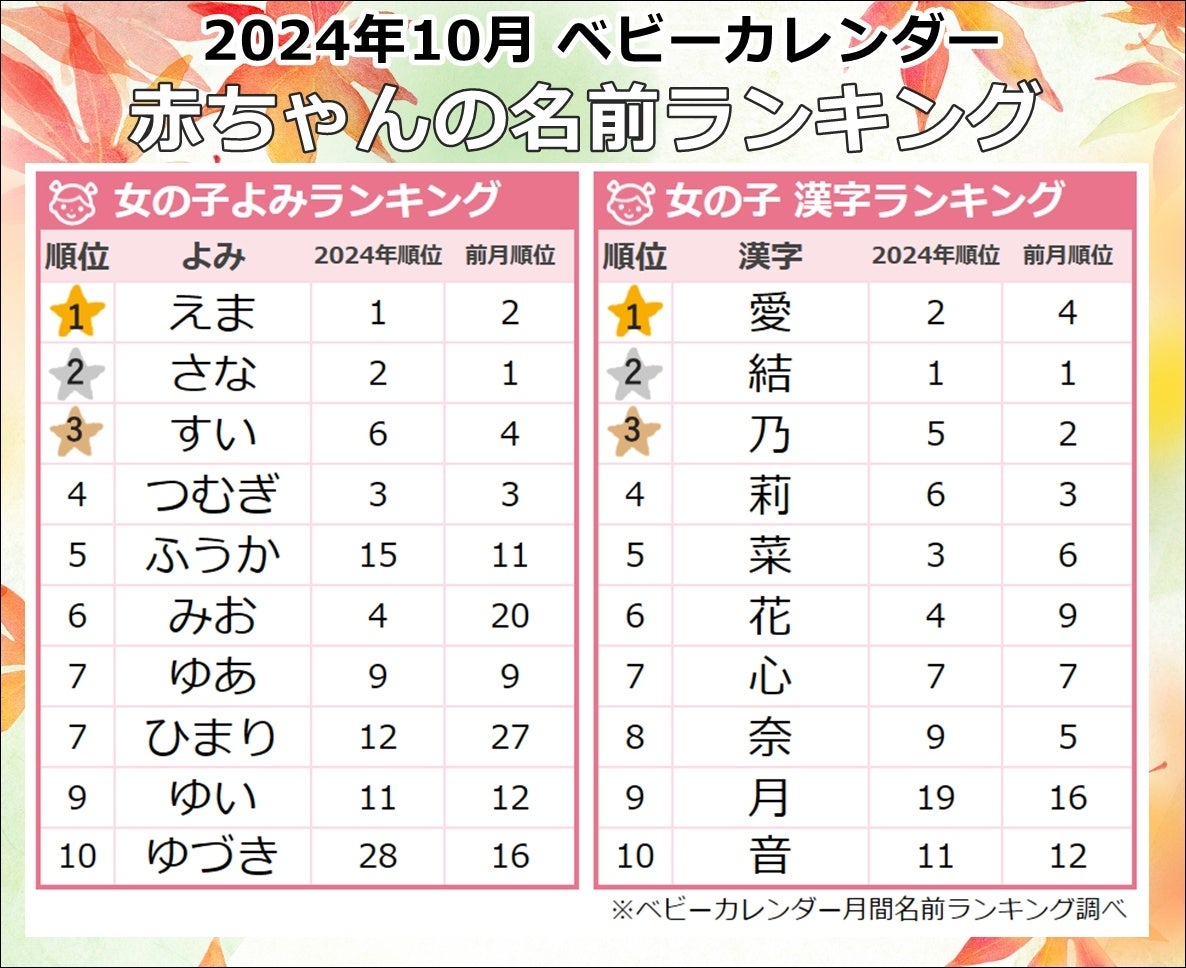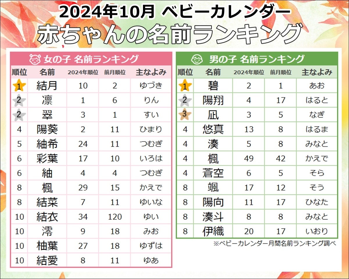 秋めく季節、男女どちらも「メープルネーム」が大人気!「ムーンネーム」も人気継続、秋感じる「あき」を用いた名前にも注目 2024年『10月生まれベビーの名付けトレンド』発表